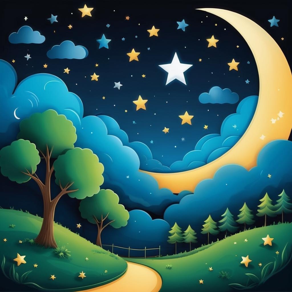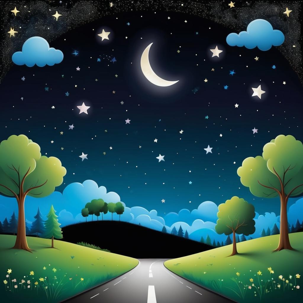 这幅作品采用简约的线条勾勒出一个夜晚的场景,包含了月亮、星星、云朵、树木和道路。色彩运用简单而富有童趣,整体画面传达了一种宁静和梦幻的氛围。图中的元素排列具有一定的对称性,构图平衡而和谐。