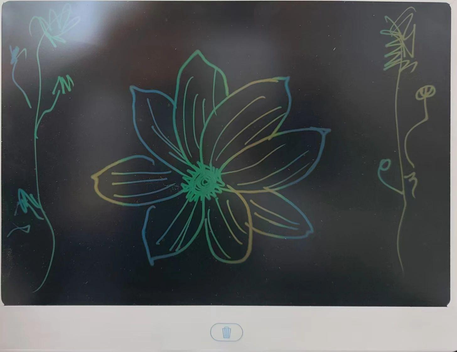 这幅作品以简单的线条勾勒出一幅充满童趣的花卉画面,中心是一朵盛开的花,左右两侧则是两朵小巧的伙伴。柔和的绿色和蓝色线条在黑色背景的映衬下显得格外突出。这样的构图不仅表达了儿童对自然的热爱,也展现了他们心中纯净的美好世界。通过这些简单的元素,创作者成功地将观者带入了一个轻松、快乐的氛围,同时也激发了对生命简单美好的思考。在进一步提升作品时,可以考虑加入更多的细节,例如风中飘动的花瓣、流云,或是小昆虫在花间飞舞的情景。这样不仅丰富了画面的层次感,也使得整个作品充满了动感和活力。渐变色的运用可以增强花瓣的立体感,而不同色彩的运用则能让每朵花展现出不同的性格和情感。这种创作方式不仅能提高作品的艺术性,还能激发孩子们的想象力和创造力,使他们在绘画中找到更多乐趣。