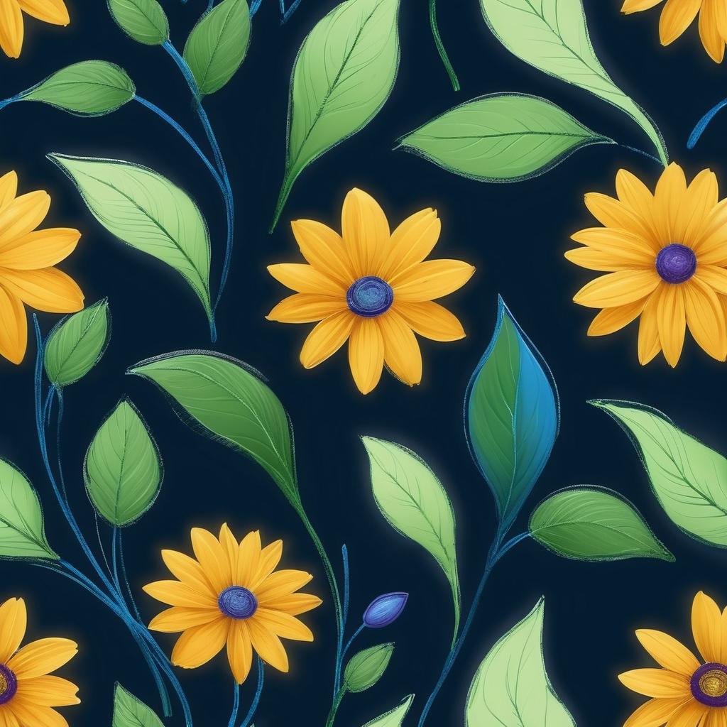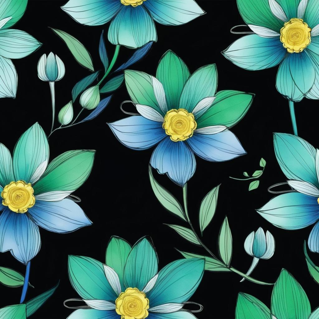 这幅作品展示了一个简单而富有童趣的花卉图案。中心是一朵大花,左右两侧还有两朵小花。线条采用柔和的绿色和蓝色,背景为黑色,形成鲜明对比。整个构图给人一种轻松、自然的感觉,似乎表达了对自然的喜爱和对生命简单美好的赞美。