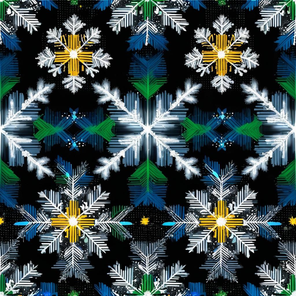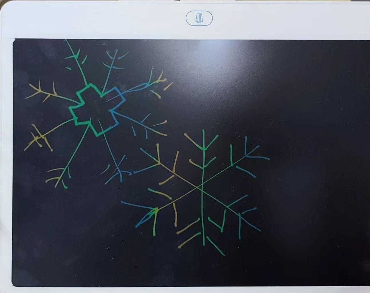 这幅作品展示了两片雪花,用彩色线条在黑色背景上绘制。雪花的形状呈现出对称的几何图案,线条颜色主要是绿色、蓝色和黄色,形成了一个简洁而富有童趣的视觉效果。作品整体给人一种宁静和冬日的感觉。