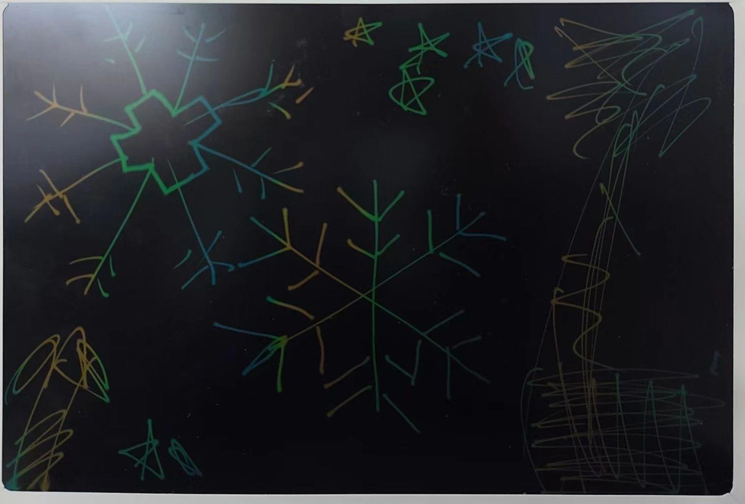 这幅作品展示了一个充满童趣的黑板画,背景为深色,上面用彩色线条勾勒出多种形状。作品中有大大小小的雪花和星星图案,整体呈现出一种自由和随性的创作风格。色彩主要为绿色、蓝色和黄色,形成一种明亮而对比鲜明的视觉效果。创作者可能试图通过这些简单的几何图形表达一种梦幻和天真的情感。