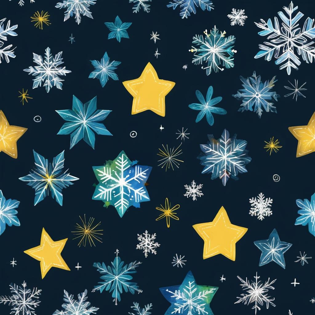 这幅作品充满了儿童特有的创造力和想象力,通过简单的线条和形状展现出一种纯真和无拘无束的表达。为了提升这幅作品,可以考虑增加一些背景元素,比如淡淡的夜空或雪地的效果,使整个画面更加立体和生动。同时,可以在星星和雪花的细节上做更多的变化,比如加入一些渐变色或者增加立体感的阴影效果,以增强作品的视觉冲击力。另外,可以在构图上增加一些层次感,比如让某些图案前后交错,增加画面的深度感。通过这些调整,这幅作品可以更好地在儿童画展中脱颖而出,唤起观者对童年无忧无虑时光的共鸣。