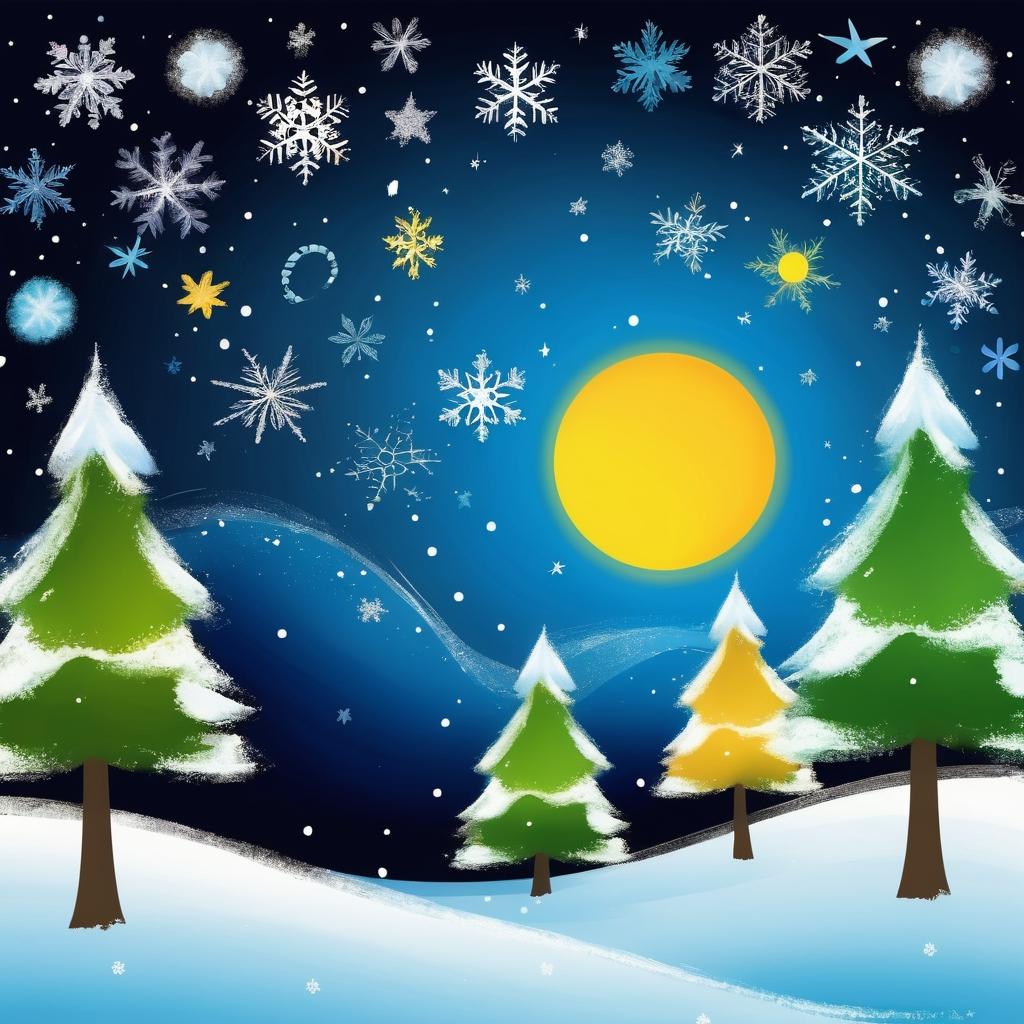 在这幅充满童趣的黑板画中,我们看到了一种纯真和无拘无束的艺术表达。深色背景上的彩色线条,构成了一个个大小不一的雪花和星星图案。这种简单而生动的创作,仿佛将我们带回到无忧无虑的童年时光。作品中绿色、蓝色和黄色的运用,使得整个画面明亮而充满活力,仿佛夜空中闪烁的星星,或冬日飘落的雪花。这幅作品不仅展示了儿童的创造力,也通过简单的几何图形传达了一种梦幻和天真的情感。为了进一步提升作品,可以在背景中加入淡淡的夜空或雪地效果,使得整个画面更加立体。星星和雪花的细节也可以通过渐变色和阴影的运用,增强视觉的冲击力。通过这些调整,这幅作品不仅更具艺术性,也更能够在儿童画展中脱颖而出,唤起观者对童年美好时光的共鸣。