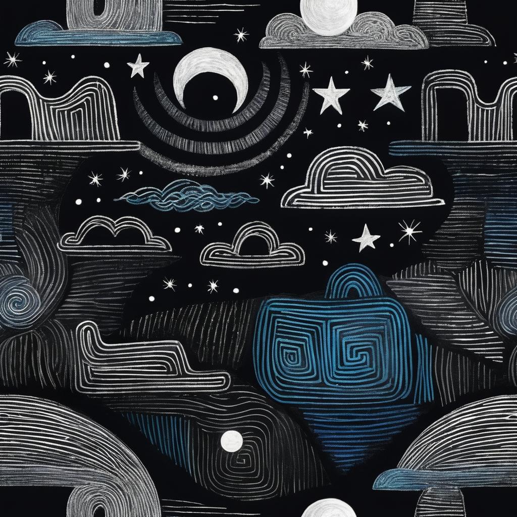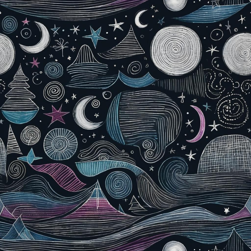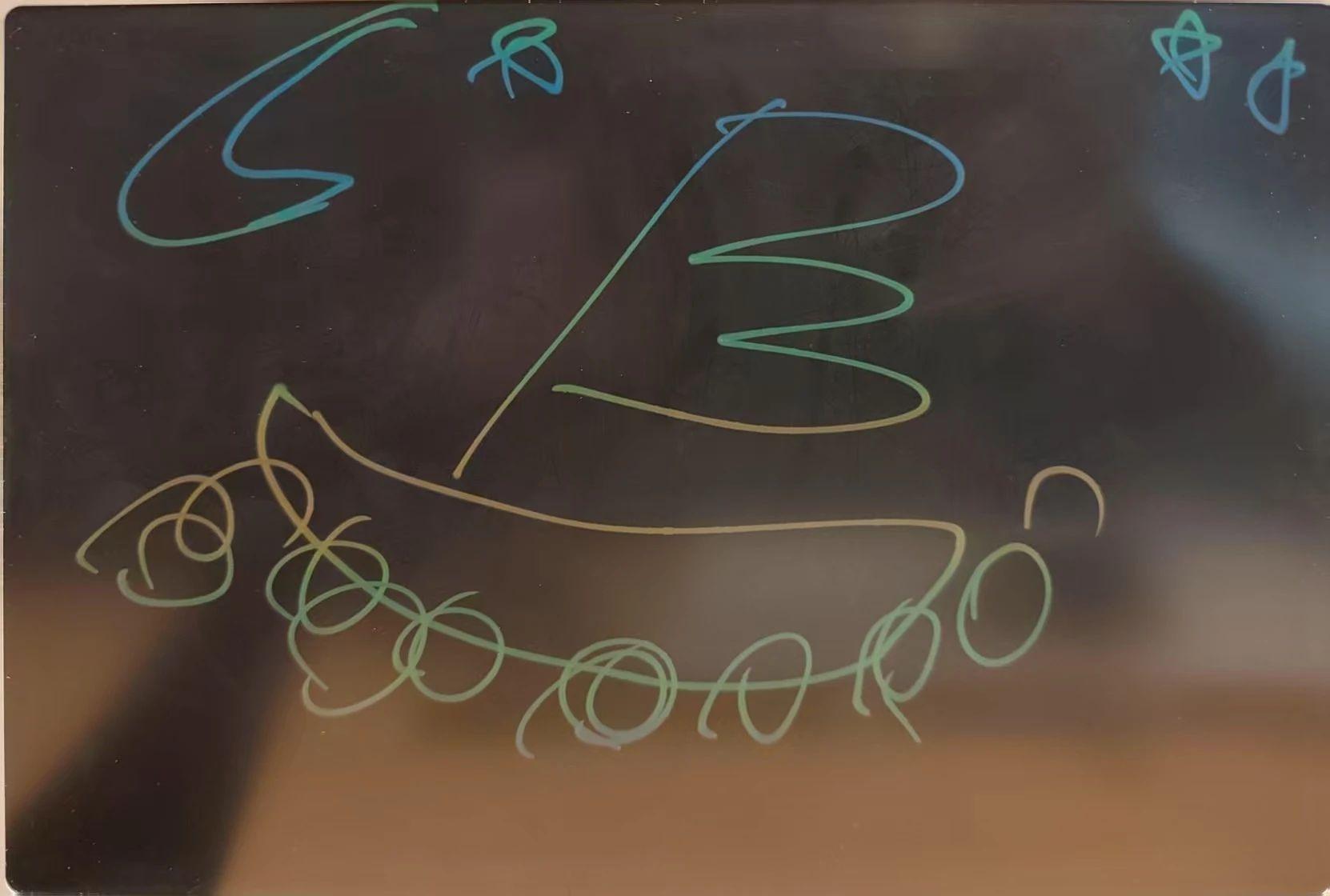 这幅作品运用了简洁的线条和明亮的颜色,可能是用笔在黑板上绘制的。主要元素包括一个由曲线组成的形状,顶部有几个星星和一个月亮。整体构图较为随意,给人一种天真和自由的感觉,似乎在表达一种童趣或幻想世界。
