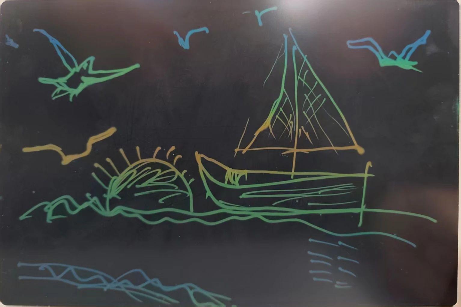 这幅简洁而充满童趣的海洋画作,使用了鲜艳的色彩和简明的构图,展现了孩子们眼中的世界。扬帆的小船、翱翔的海鸟和落日的图景,无不传达出一种对自由与自然的向往。画面中的每一笔线条都显得随性而自然,仿佛是孩子们用手中的蜡笔自由描绘出的心中景象。