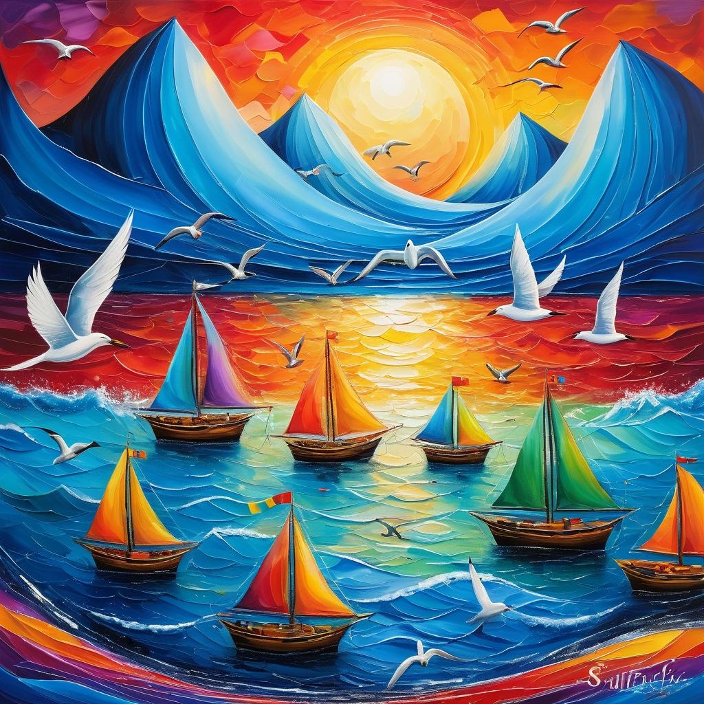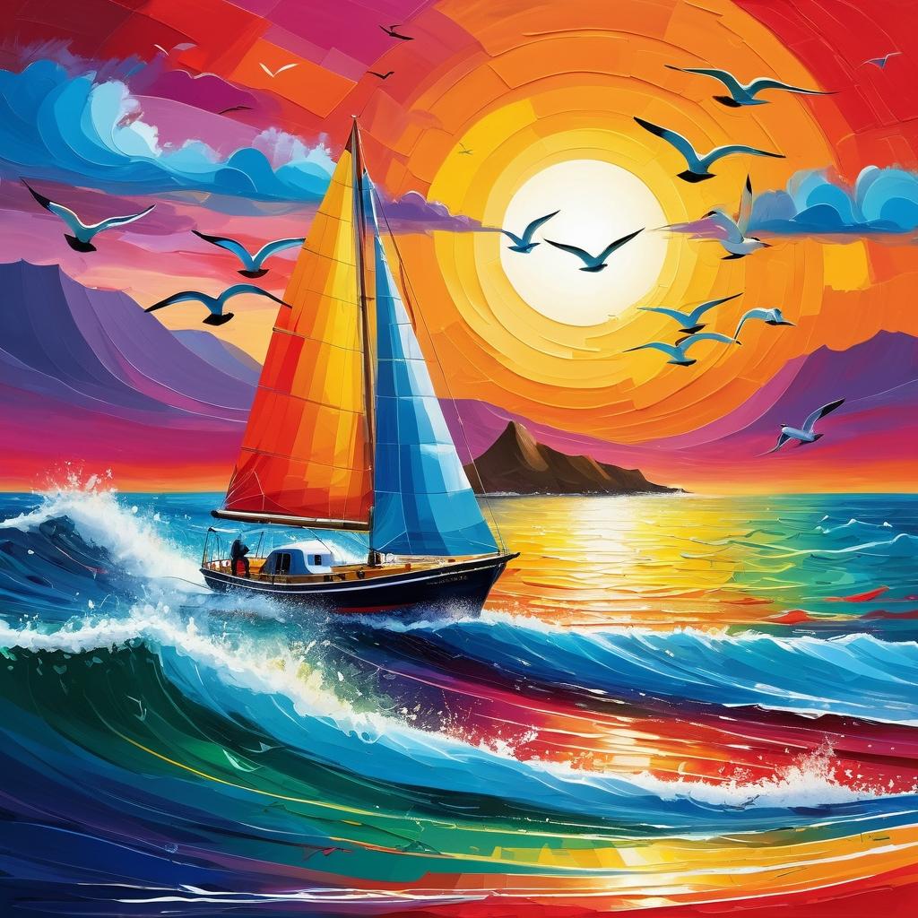 这幅画用简单的线条和鲜艳的色彩勾勒出海洋主题的场景。主要元素包括一艘扬帆的船、海面上的波浪、几只飞翔的海鸟,以及一个正在落下的太阳。整体构图简洁明了,给人一种宁静且略带童趣的感觉,可能传达了对大自然和自由的向往。