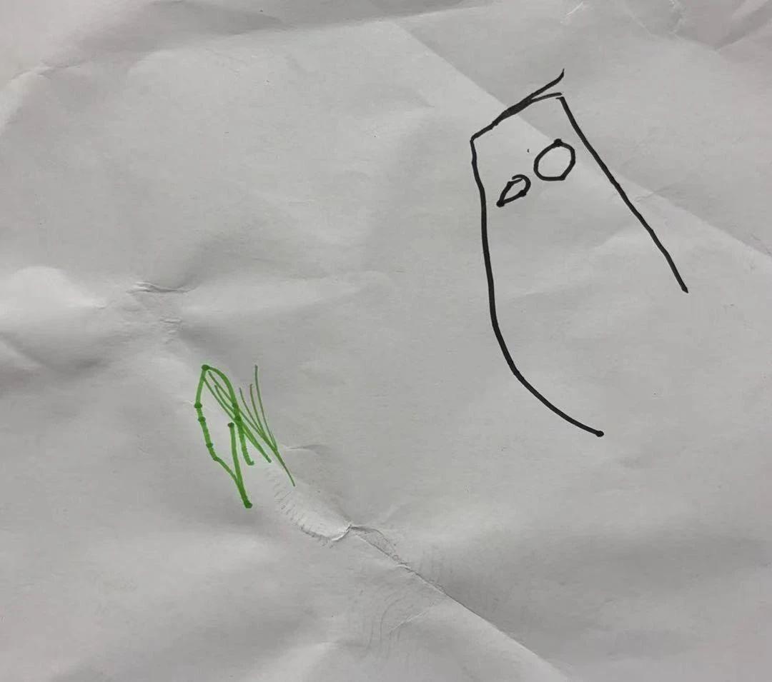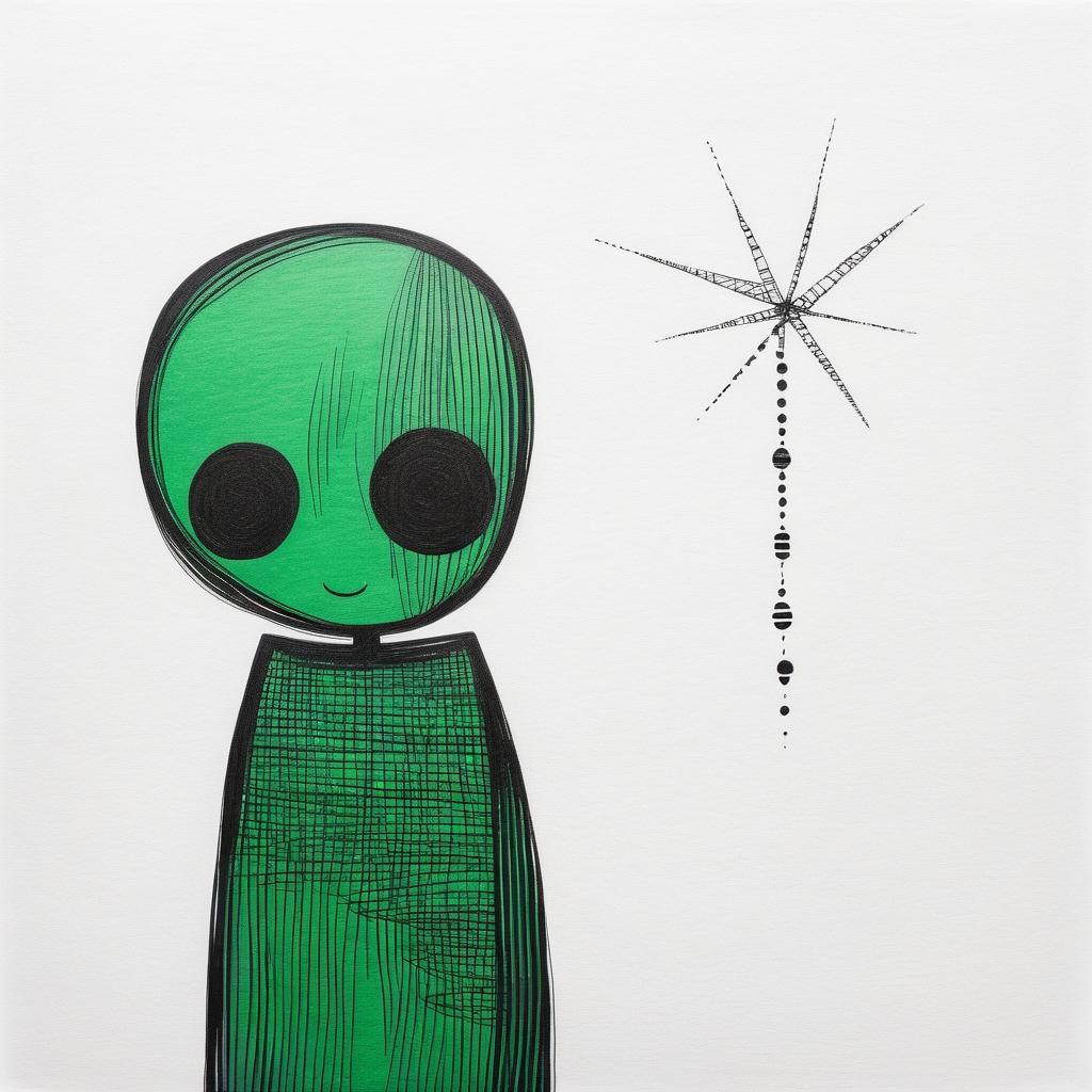 这幅作品通过简单的线条和图案,展现了孩子般的想象力和创造力。从画面中我们可以看到,创作者运用了黑色和绿色两种基本色彩,形成了两个主要的视觉焦点。黑色的线条勾勒出一个抽象的形状,似乎是一个幽灵般的形象,而绿色的线条则形成了一个独特的图案。作品的大量留白给予观众充分的想象空间,能够让不同的人看到不同的故事和情感。