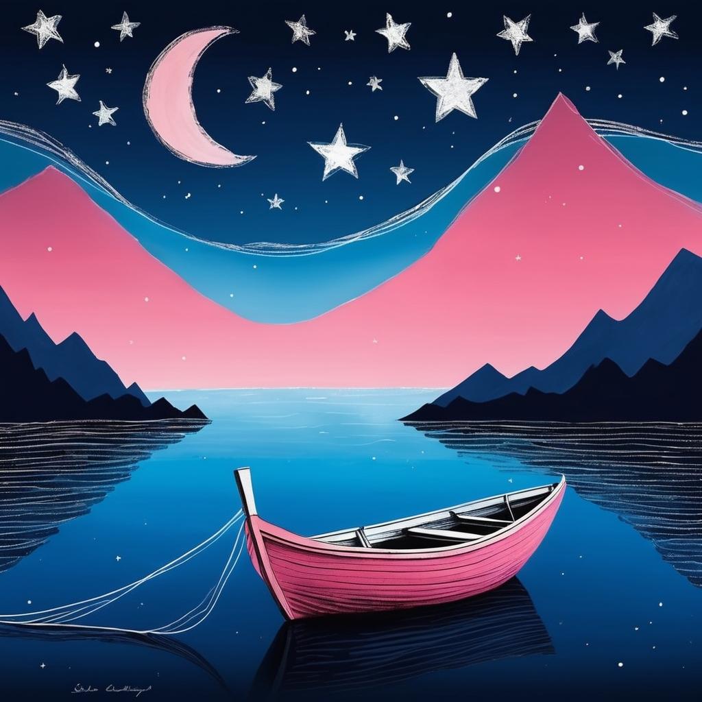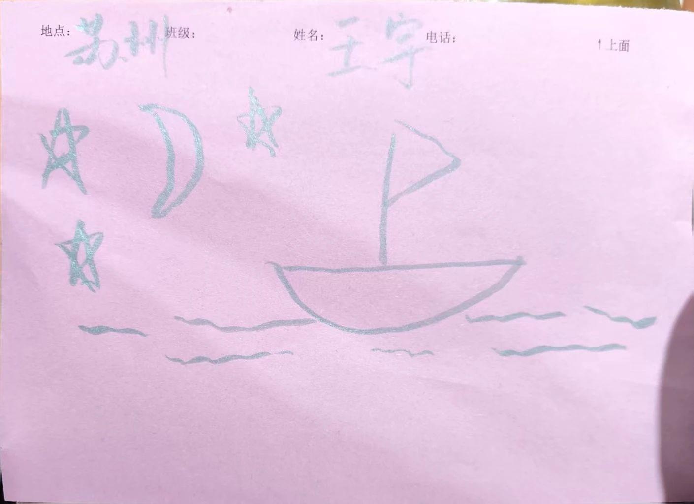 这幅作品运用了简单的线条勾勒出夜空中的一艘小船,周围有星星和月亮。颜色上以柔和的蓝色在粉色的纸上表现,营造出一种宁静的氛围。构图简洁明了,充满了童趣和幻想。创作者可能在表达一种对大自然的憧憬和自由的向往。
