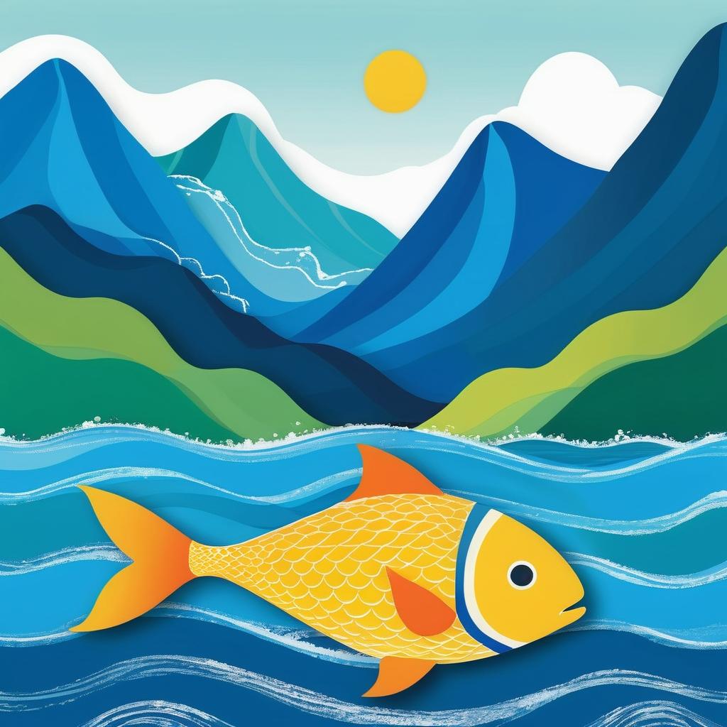 这幅画以简洁的线条和明亮的色彩捕捉了自然的生机和活力。为提升作品的艺术性,可以增加细节,如鱼的鳞片或水的反光效果,来丰富视觉层次。此外,可以考虑使用渐变色来表现水流的动感和太阳光的照射,从而增加画面的动态感。如果将背景的山峰细化,添加一些植被或光影效果,会使画面更加立体和真实。通过这些改进,作品将更具深度和艺术感染力,并能更好地与观众产生情感共鸣。
