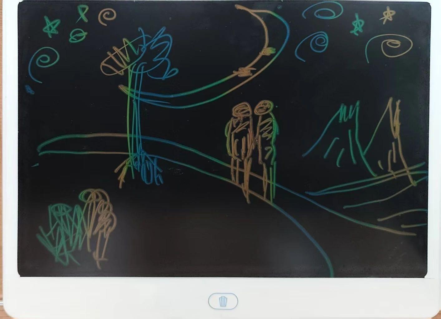 这幅作品以其简单的线条和童趣的色彩,展现了一个宁静而梦幻的夜晚场景。画中两个人物站在蜿蜒的小路上,仰望着星星闪烁的夜空,背景中隐约可见山峦的轮廓。简单的构图和鲜明的色彩对比,使得这幅画充满了童真与幻想。