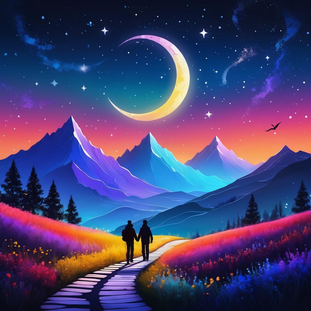 这幅作品使用了简单的线条和鲜艳的色彩,描绘了夜晚的场景。画中有一对人物站在曲折的小路上,周围是星星和月亮,背景中有山的轮廓。整体构图简单但富有童趣,色彩对比强烈,传递出一种宁静而梦幻的氛围。
