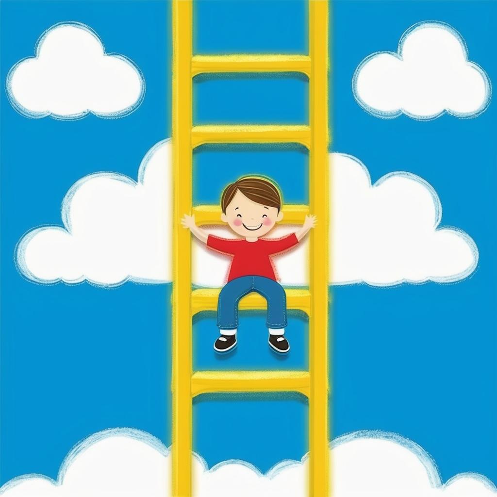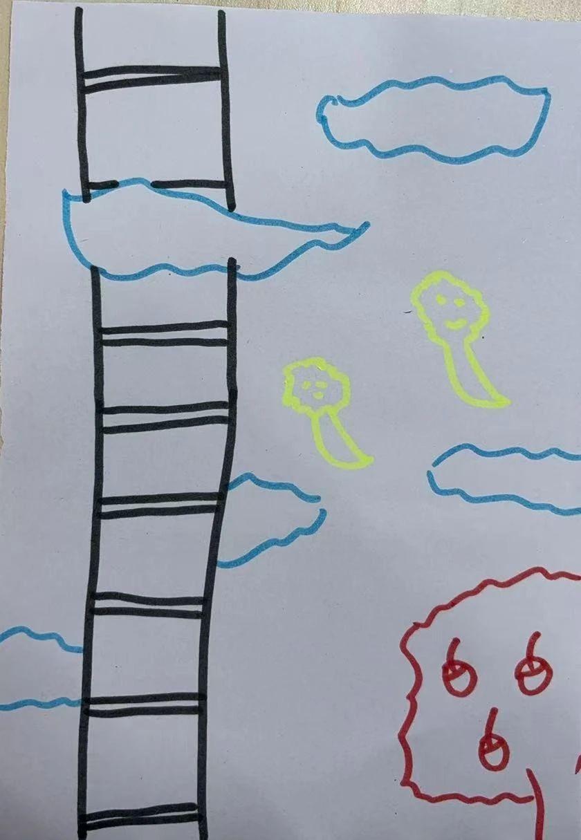 这幅画呈现了一个简单而富有童趣的场景,主要元素包括一架梯子、云朵和两个微笑的黄色形象。画面中使用了明亮的颜色,如黑色、蓝色、黄色和红色,构图简洁,给人一种轻松愉快的感觉。创作者可能试图传达一种童真和想象力的主题,仿佛梯子可以通向天空和云端。