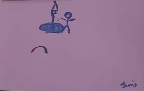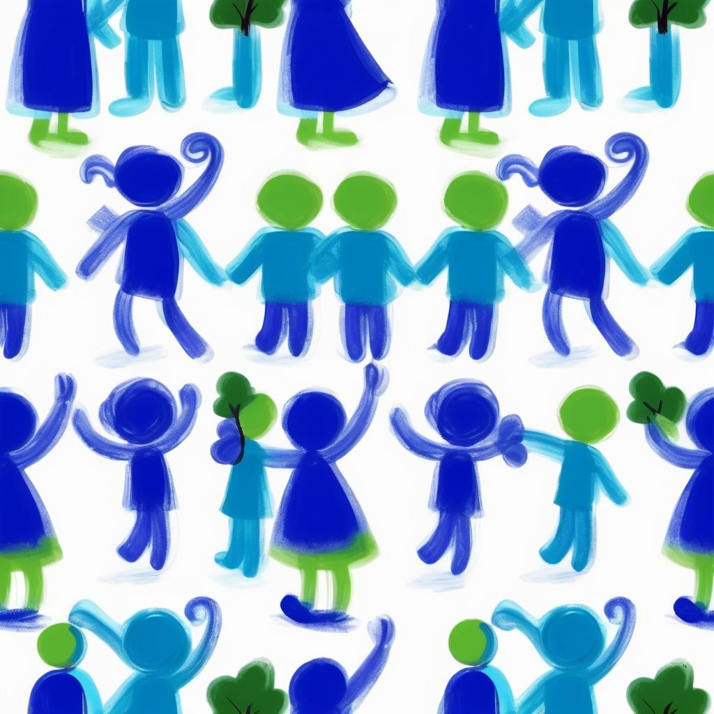 这幅作品以简单的线条和图形呈现,主要使用蓝色在浅色背景上作画。画中人物似乎在从事某种活动,可能是在跳舞或运动。画面构图以简洁为主,情感表达富有童趣和想象力。