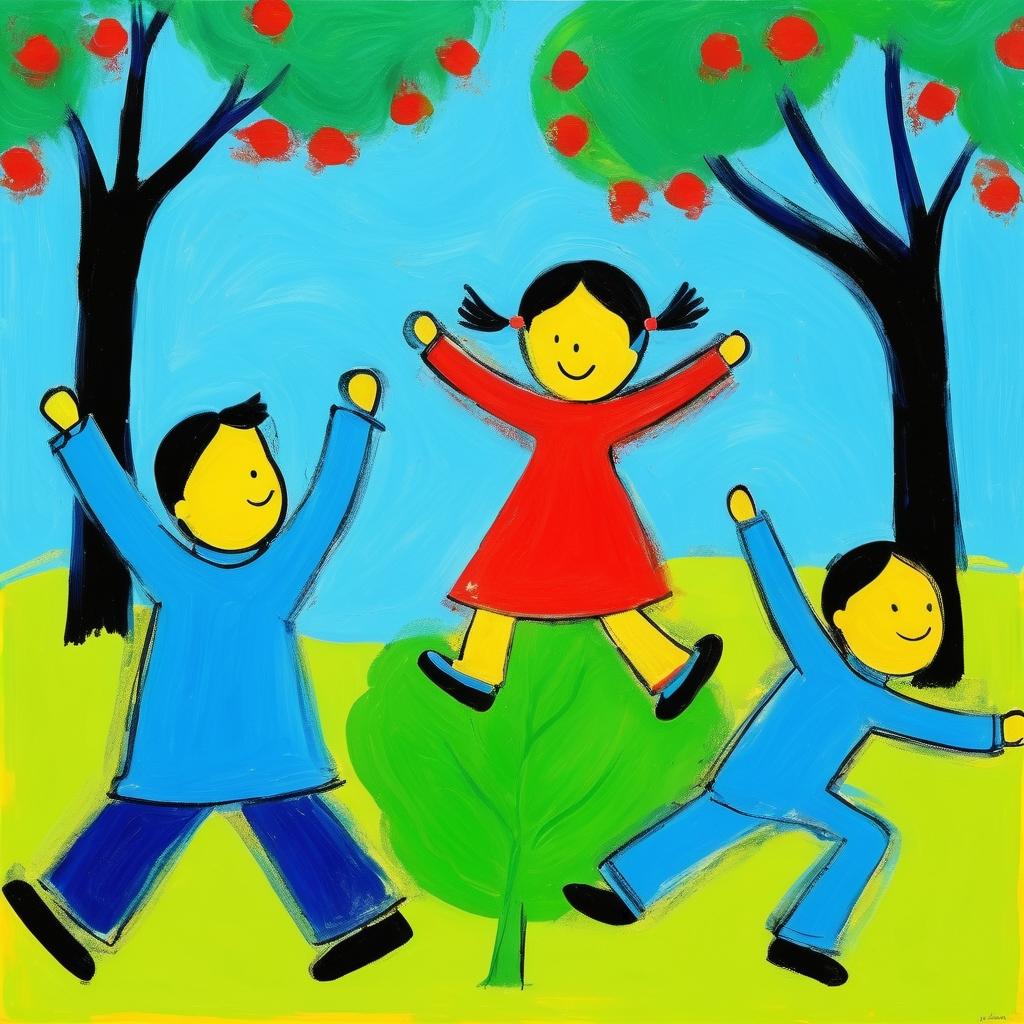 这幅作品以简单而充满童趣的方式呈现了孩子心中的世界。画作中,蓝色的线条勾勒出人物的形象,似乎在进行某种舞蹈或运动。这种表现手法让人想起儿童对世界的简单而纯粹的观察。画面的构图虽然简洁,但却不失趣味,带给观者一种轻松愉悦的感觉。