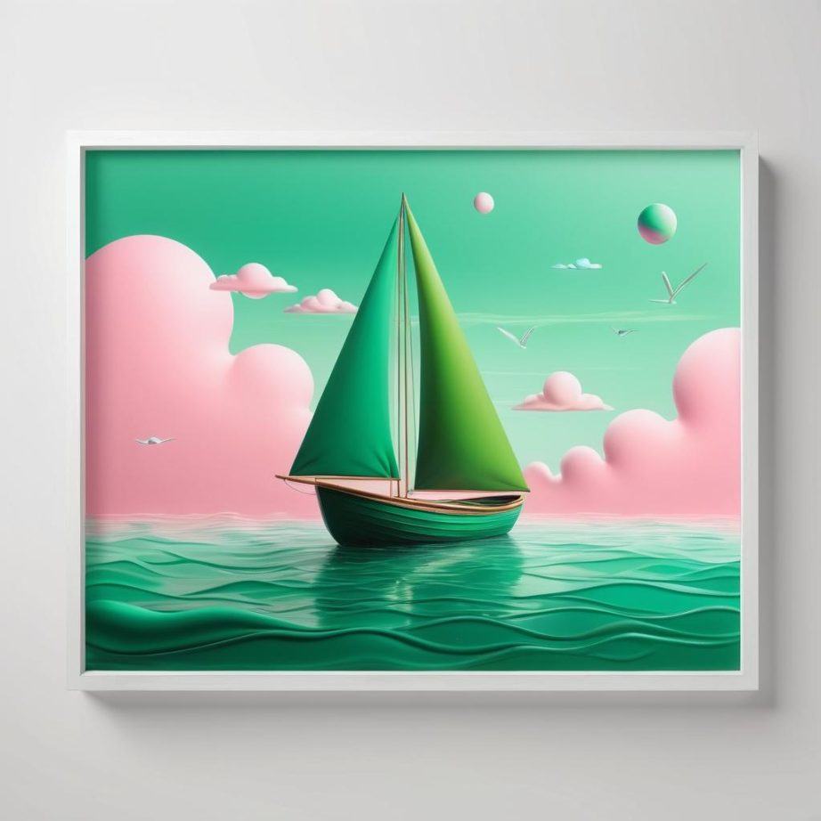 这幅作品中主要使用了绿色和粉色的对比色调,绿色形状类似于一艘船,背景是平坦的粉色。构图简单,可能表达一种漂浮或悬挂的状态,给人以轻松和幻想的感觉。创作者可能想传达一种自然与梦想的结合。