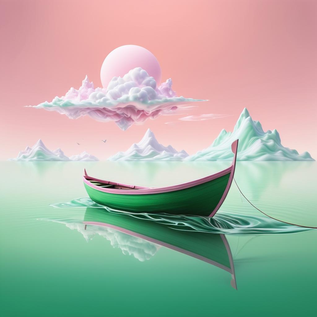 这幅作品以其简单而富有童趣的构图吸引了观众的目光。画中的绿色形状让人联想到一艘小船,漂浮在粉色的背景中,仿佛置身于一个梦幻般的世界。这样的构图不仅体现了创作者对色彩的敏锐感知,也展现了他们对简单线条和形状的巧妙运用。通过使用对比色调,作品传达出了一种轻松而愉悦的氛围,仿佛在邀请观者进入一个充满幻想的时空。为了进一步丰富画面的层次感,可以考虑在背景中添加一些细微的细节,如柔和的波纹或漂浮的云朵,这将有助于增强画面的故事性和视觉吸引力。此外,在绿色形状上添加纹理或渐变色可以为作品带来更多的生动感和立体感。这样的调整不仅会提升作品的艺术性,也会让观者在欣赏时产生更加深刻的情感共鸣。总之,这幅作品通过其简约而充满想象力的表现手法,为我们带来了一个探索童趣和梦境的艺术旅程。