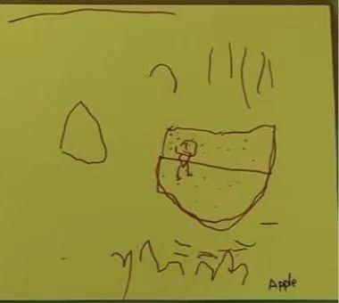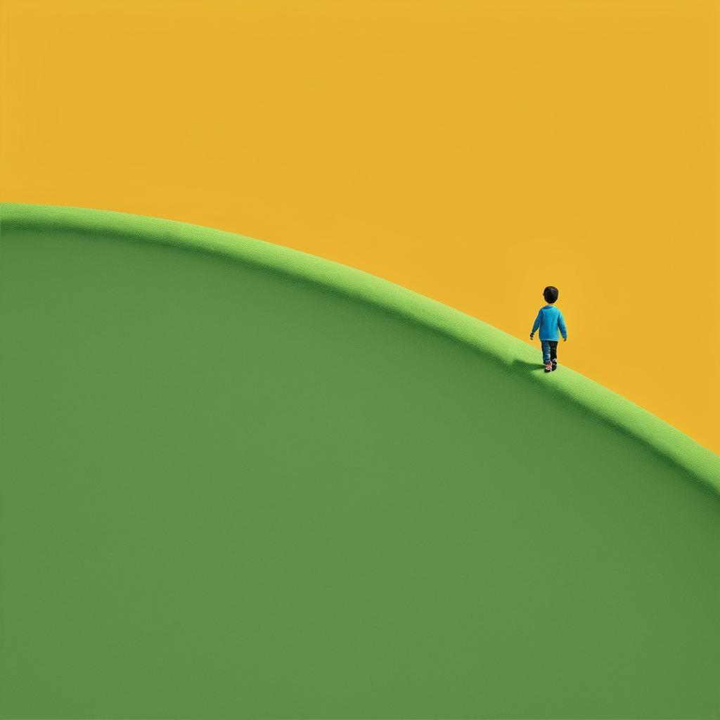 这幅作品使用简单的线条和单一的颜色背景,呈现出一种儿童画的质朴风格。主体似乎是一个小人站在一个不规则形状的区域中,上方有一些线条可能代表文字或符号,左侧有一个独立的形状。作品传达出一种天真无邪和探索的感觉。