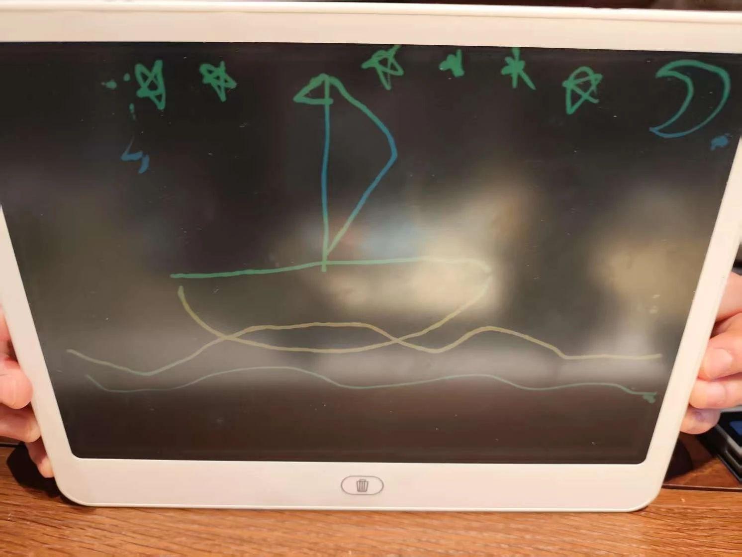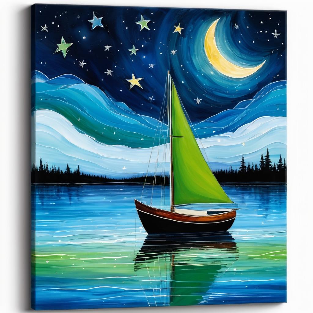 这幅图像展示了一艘小船在夜空下航行的场景,简单的线条和形状勾勒出了一幅充满童趣和幻想的作品。背景中的星星与月亮以绿色和蓝色为主,营造出一种宁静而梦幻的氛围。可能传达了一种关于旅行、探索或宁静的主题。作为一名儿童艺术专家,我看到这幅作品在表达简单和纯真的快乐上是非常成功的。为了进一步提升作品的艺术价值,可以考虑在夜空中增加更多的星星细节和丰富月亮的光影效果,以增强视觉吸引力。此外,在水面上加入一些反射效果,不仅能增加画面的动态感,还能让观众感受到一种身临其境的感觉。通过调整船只的角度或位置,也可以给人一种更强烈的运动感和方向感,从而更好地传达探索的主题。这些改进不仅可以使作品在视觉上更加吸引人,而且能在情感上引起观众更深的共鸣。