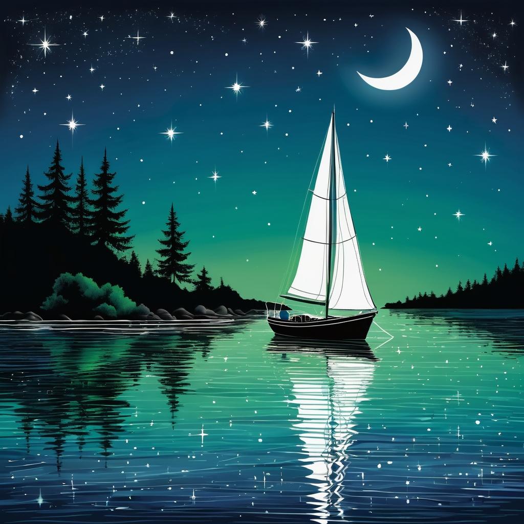 这幅图像展示了一艘小船在夜空下航行的场景,背景是星星和月亮。图像使用了简单的线条和形状,色彩上以绿色和蓝色为主,可能传达了一种宁静和梦幻的氛围。创作者可能是在表达一种关于旅行、探索或宁静的主题。