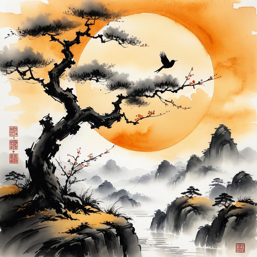 光影的处理是本作的亮点之一,柔和的色调使得整个画面充满了温暖和宁静。通过更精细的光影变化,作品可以更具视觉冲击力,使其在传统水墨画领域更具辨识度和艺术感染力。这种艺术表达不仅是对自然的再现,更是一种心灵的宁静与对生活的思考。