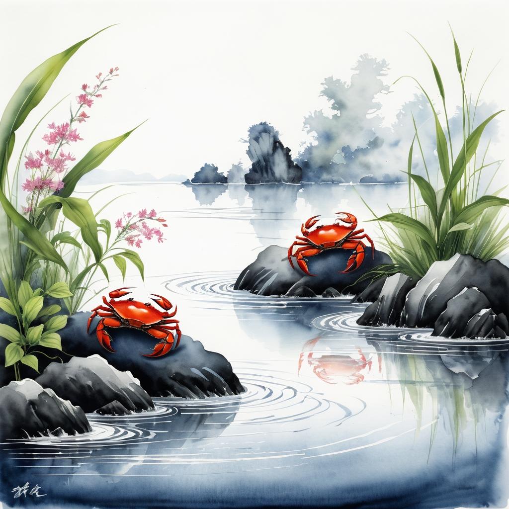 在这幅充满东方风情的水墨画中,艺术家以寥寥数笔勾勒出了两只螃蟹在水中嬉戏的场景,充分展示了传统水墨画的独特魅力。作品中,螃蟹的形象通过墨色的深浅变化展现出立体感,而周围的水草则用轻快的笔触描绘,增添了画面的动感和生机。这种表现手法不仅强调了螃蟹与水草之间的对比,还通过简洁的构图和自然的氛围,传达了一种闲适和谐美的意境。为了进一步提升作品的艺术性,可以考虑加入更多的背景元素,比如水流的细纹或者其他水生植物,以丰富整体的视觉效果。同时,通过丰富墨色层次来表现光影效果,使螃蟹的形象更加立体生动。这种处理手法不仅能够增强作品的深度和艺术性,还能让观者在欣赏画作时,感受到大自然的生趣和画家的独特情感。