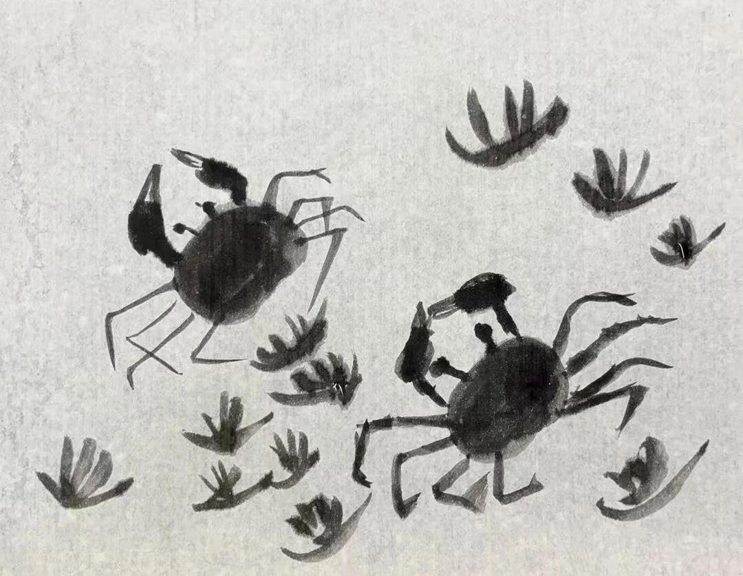 画面中两只螃蟹的形象生动,笔触简练而有力,传达出一种自然和自由的氛围。留白的运用突出主体,增强了画面的宁静感。螃蟹的姿态各异,展现了动势与活力。