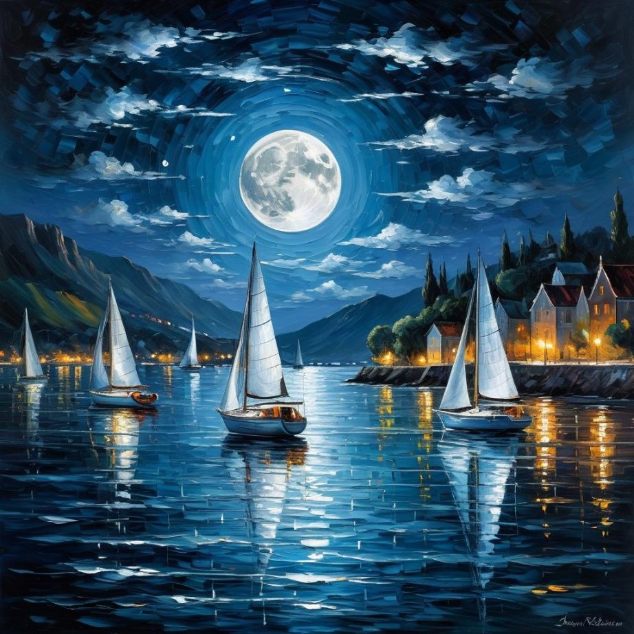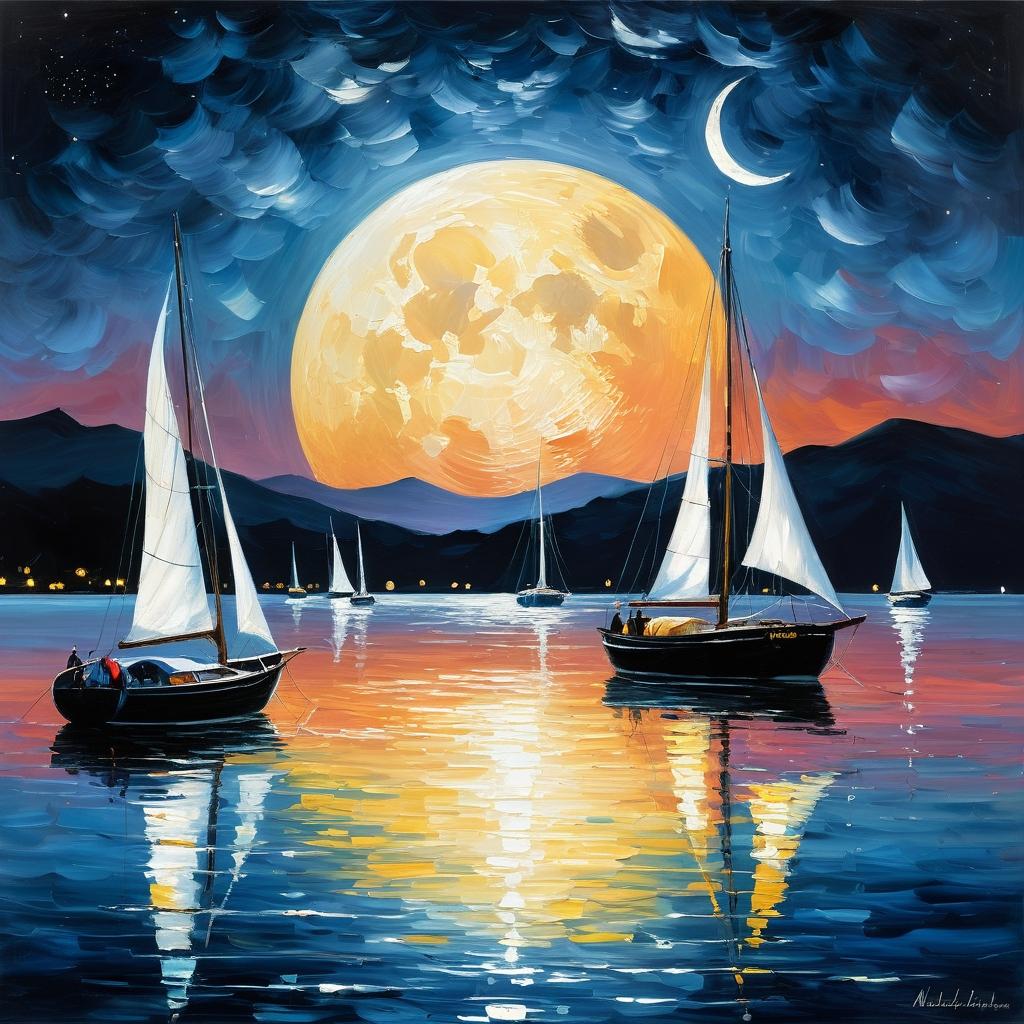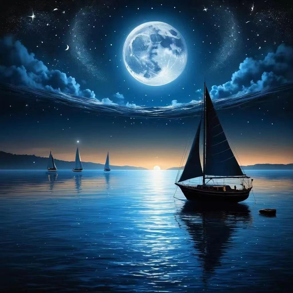 在这幅名为《月夜航行》的作品中,艺术家通过色彩与构图的巧妙搭配,展现了一幅宁静而富有深意的夜景。画面中,月亮高挂夜空,其明亮的光辉洒在海面上,营造出一种梦幻般的氛围。几艘帆船轻盈地漂浮于水面,船只的倒影与波光粼粼的效果相得益彰,增强了画面的动感与层次感。