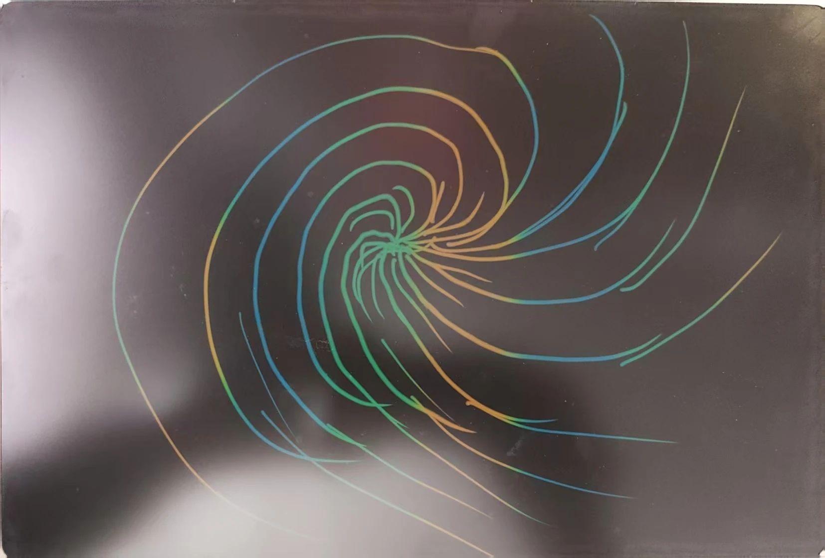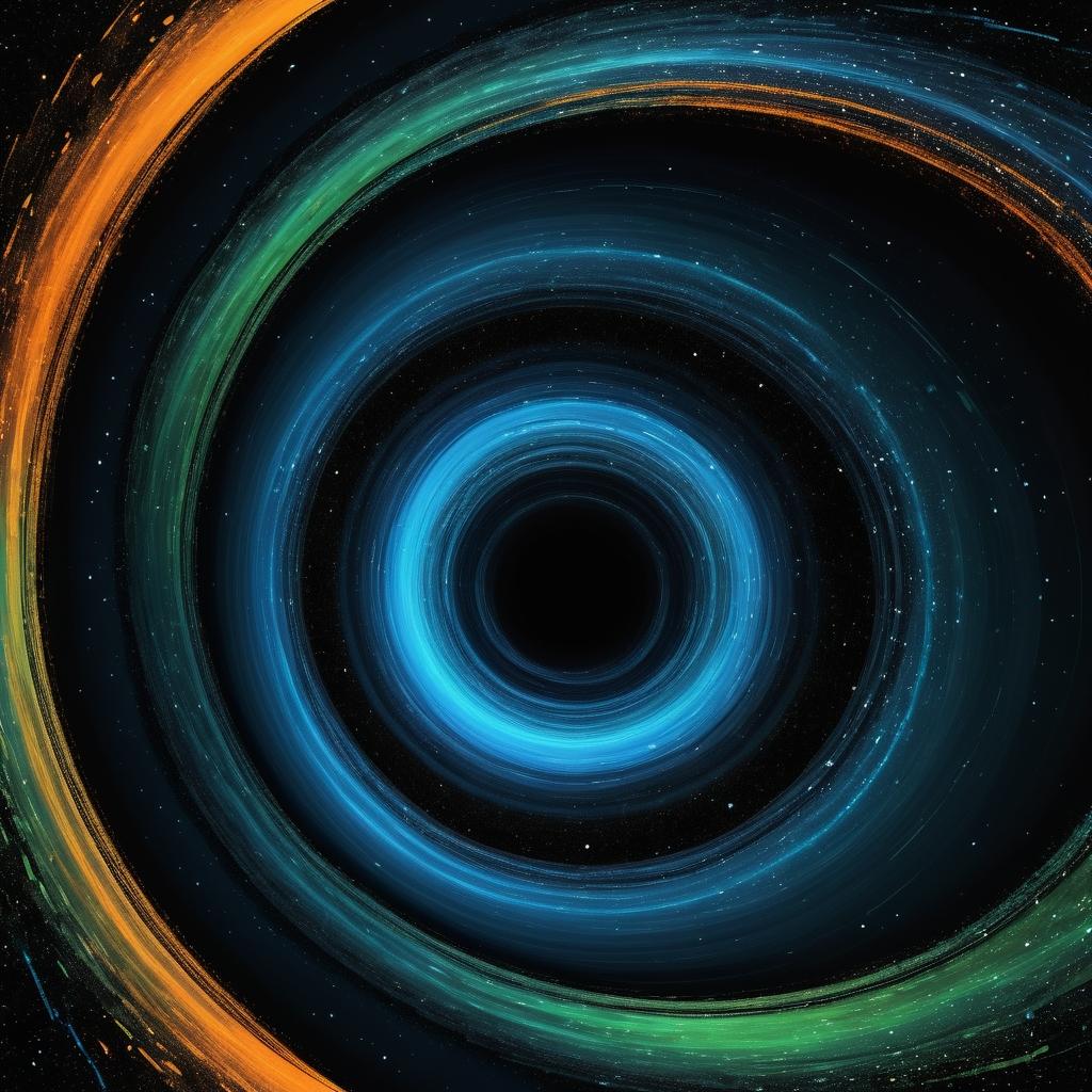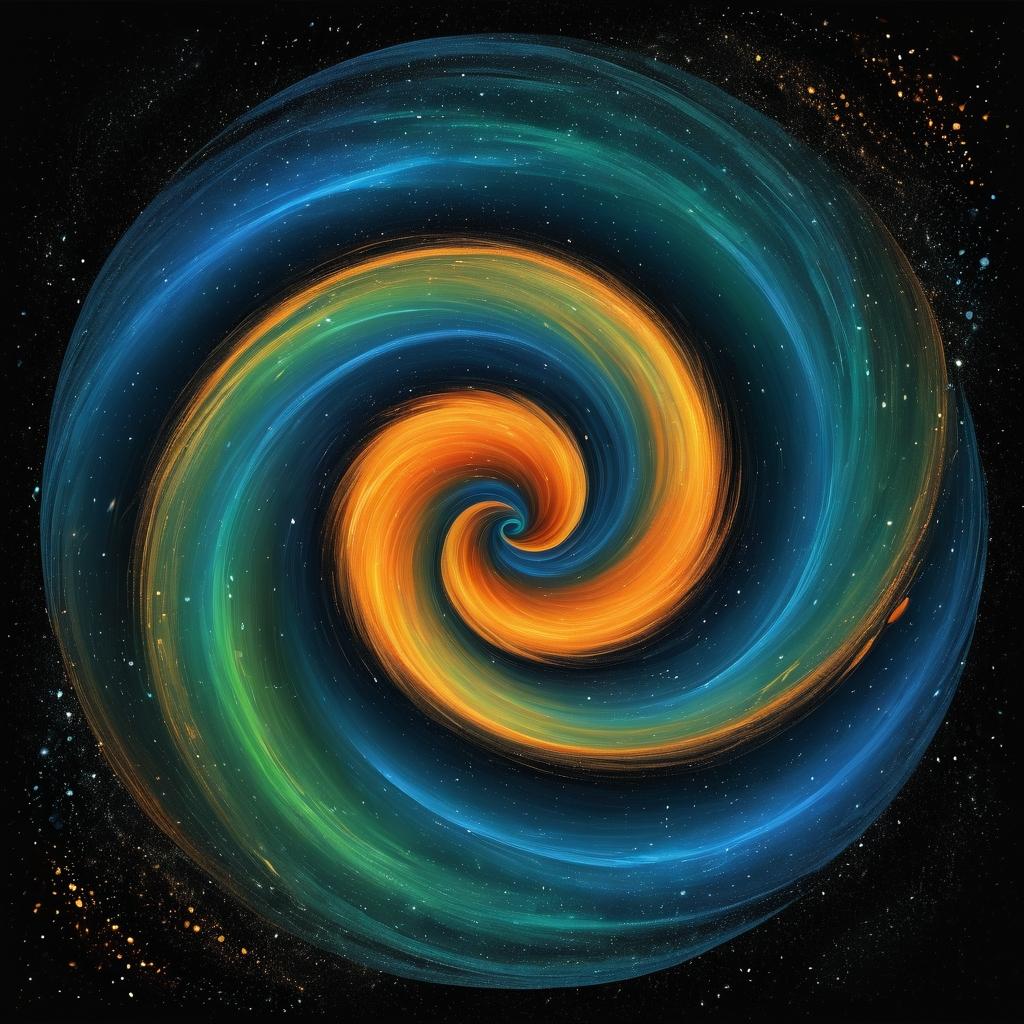 这幅作品以其色彩渐变的漩涡形状吸引着观众的目光。黑色的背景为蓝色、绿色和橙色的线条提供了一个鲜明的对比,使得整个画面充满了动感和活力。这种设计简约而又不失深度,给人一种宇宙或自然力量的集中之感。艺术家通过这些旋转的线条,成功地传达出一种神秘和永恒的感觉,仿佛在讲述宇宙的故事。
