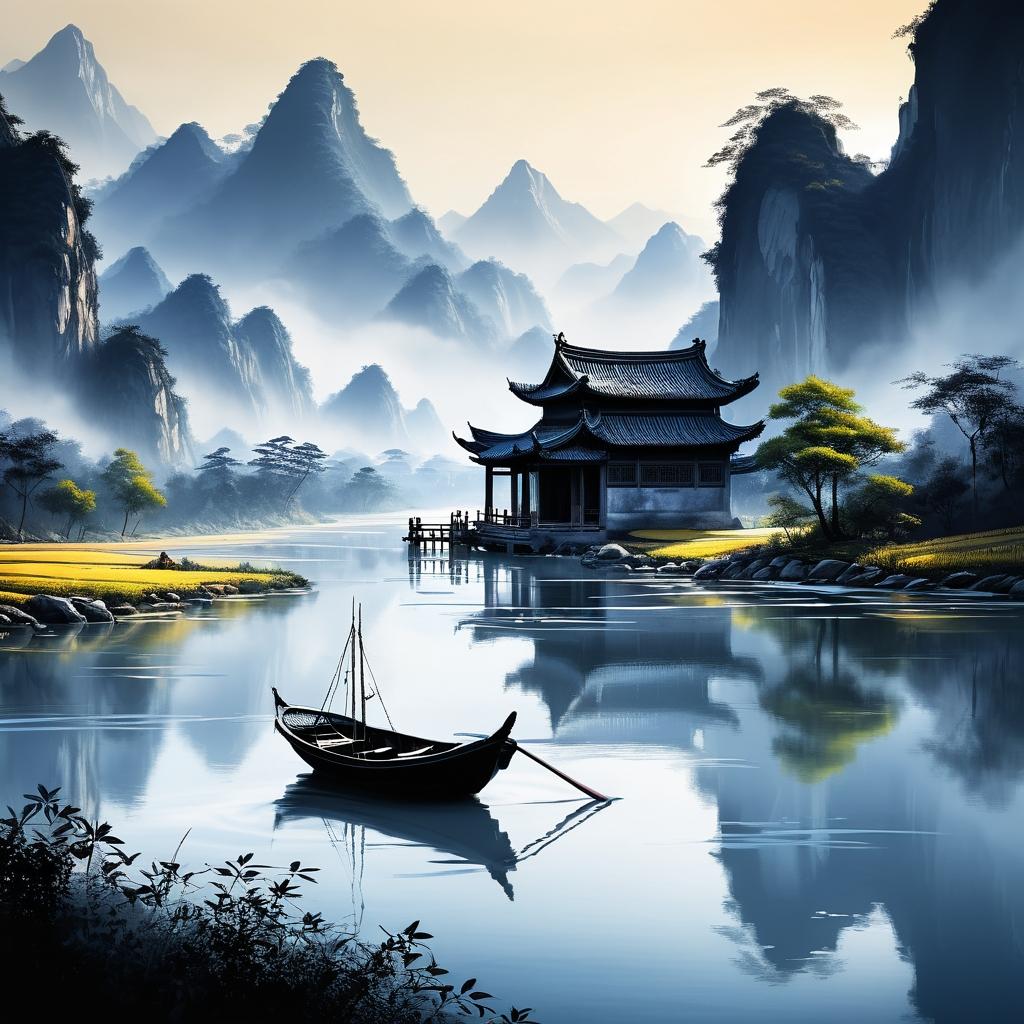 这幅水墨画通过简洁的笔触和淡雅的色彩,成功地表达了自然的宁静与和谐。为了提升作品的深度,可以增加更多的细节,例如在山峦的阴影部分加以细腻的纹理处理,使山体更具立体感。同时,可以在河流和小船周围加入一些水波纹,增加动态效果。此外,通过在背景中添加层次感,可以增强画面的空间深度,使作品更加引人入胜。通过这些改进,可以进一步提升作品的艺术感染力,使其在传达自然之美的同时,也能引发观者的情感共鸣。