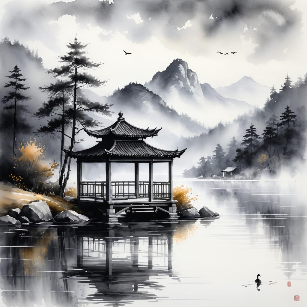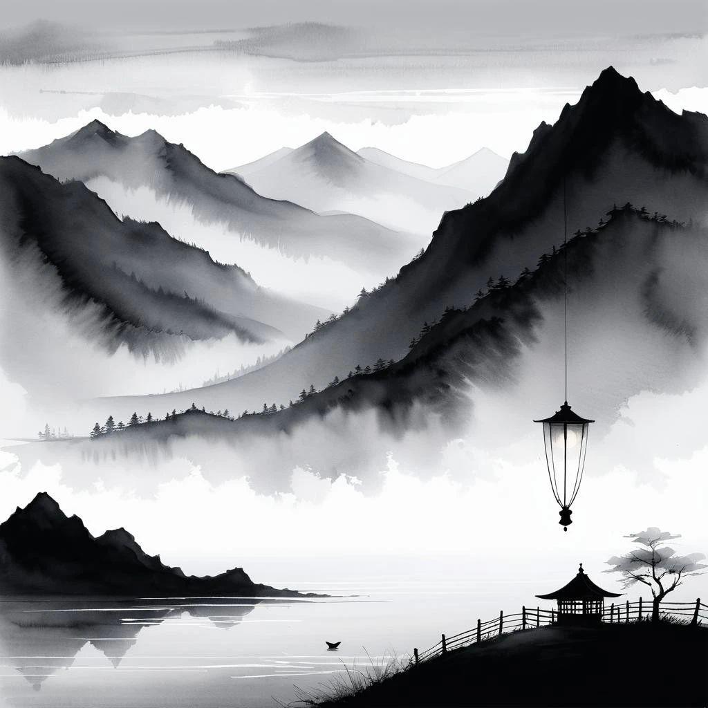 这幅作品采用水墨风格,主要元素是连绵的山峦、湖泊、灯笼、小亭和一只鸟。整体色调是黑白灰,构图上以对角线和层次感为主,给人宁静悠远的感觉。创作者可能在传达一种自然与人类建筑和谐共存的主题,以及对静谧和内心安宁的渴望。