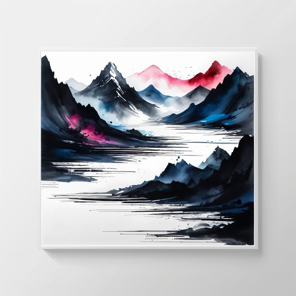 这幅水墨作品以其简练的笔触和浓淡相间的墨色,展现了自然景观的抽象美。作品中的几何形状排列如同山脉与水流交错,营造出一种宁静而又充满活力的视觉体验。创作者通过流畅的笔触表达对大自然的敬仰,仿佛在诉说着自然的永恒与力量。为了更加丰富作品的表现力,可以考虑在墨色的层次中添加更多的细节。通过在阴影部分引入微妙的纹理变化,使得画面更具立体感和深度。此外,融入一些细微的植物轮廓或隐约的动物形象,能够赋予作品更多的故事性。这种细节的增加,不仅能够保持作品原有的简约风格,还能让观者感受到更深层次的情感共鸣。总之,这幅作品是自然之美的现代诠释,通过抽象的表现方式,传达出深邃的艺术思想。